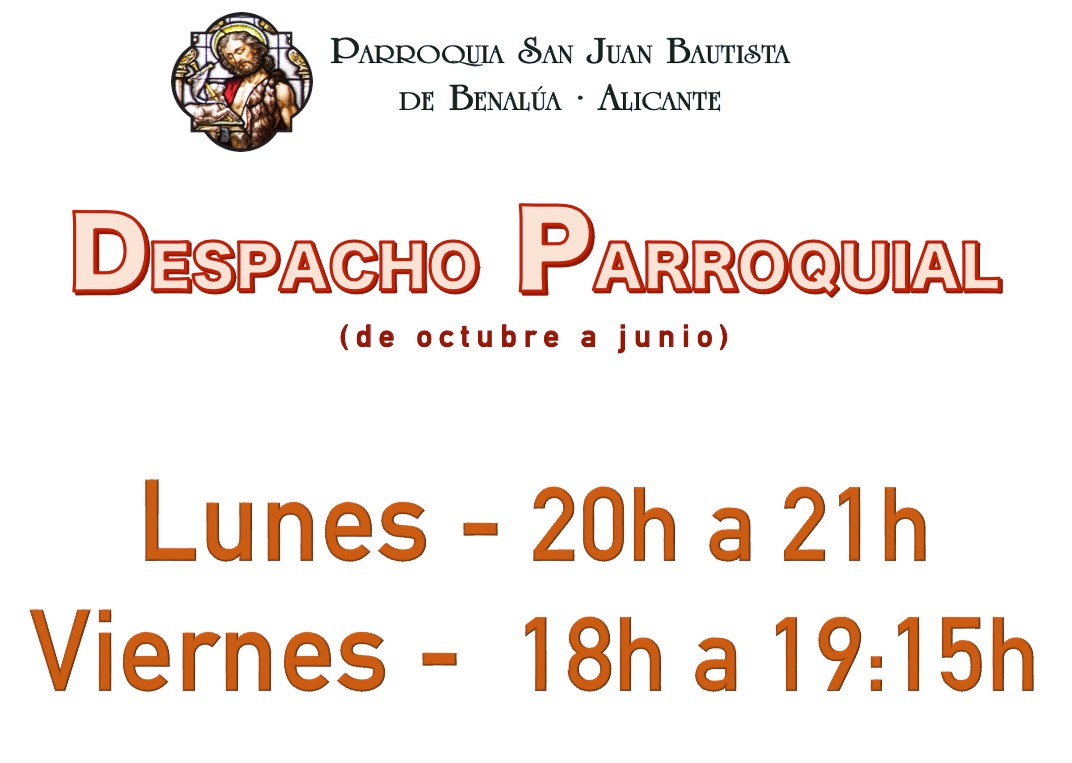 NUEVO HORARIO DESPACHO PARROQUIALYou are here: HomeDestacado, Info ParroquiaNUEVO HORARIO DESPACHO PARROQUIAL Posted on 29 septiembre, 2025 Por: ParroquiaDestacado Info Parroquia FacebookshareTwittertweet Entradas relacionadasNUEVO HORARIO DE MISAS29 septiembre, 2025COLABORA con la Emergencia31 octubre, 2024NUEVO HORARIO DESPACHO1 octubre, 2024